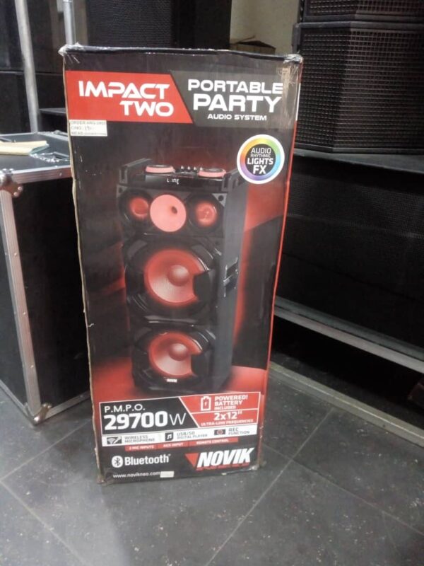 Description novik’s impact two is the ultimate in dj systems. with 29700w of maximum power output, this system will take your party to the next level. its led lights offer a wonderful glow to the party. system powered by a long-lasting battery, play your music where you want and as much as you want. wireless streaming lets you control everything from your smartphone. general specifications: compact 2-way powered portable system opera with long lasting rechargeable battery usb / sd bluetooth (r) mp3 player 2×12 woofer 2×3 tweeter led display fm radio wireless microphone 2 wired microphone inputs echo control auxiliary line input 3.5mm 2-band equalizer remote control compact system for easy and comfortable portability with side handles and wheels