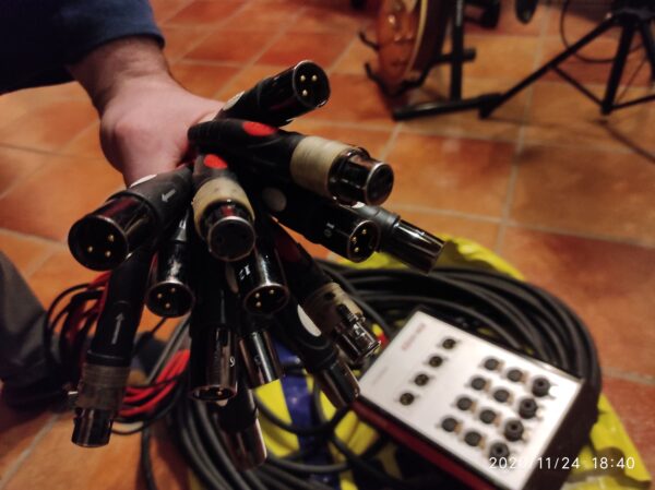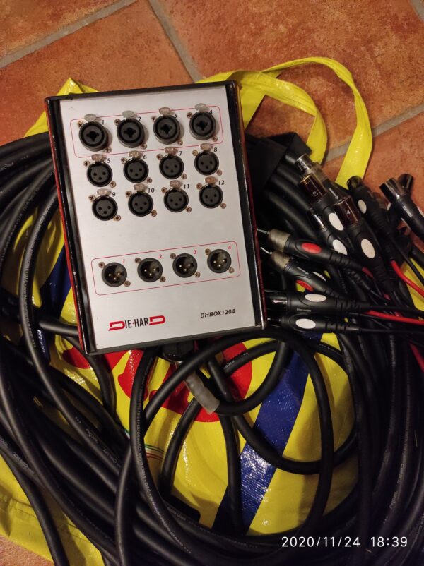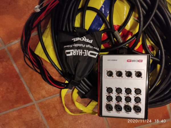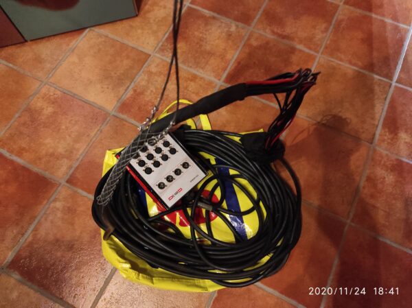 Multipair cable with 12 XLR 3-pole female, 6 COMBO XLR 3-pole /6.3 mm Ø Panel JACK female, 6 XLR 3-pole mounting male plugs. Professional multicore audio cable with 12 XLR cable 3 poles, male plugs, 4 XLR cable 3 poles female, length 25 Mts