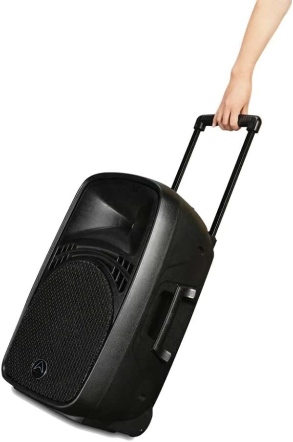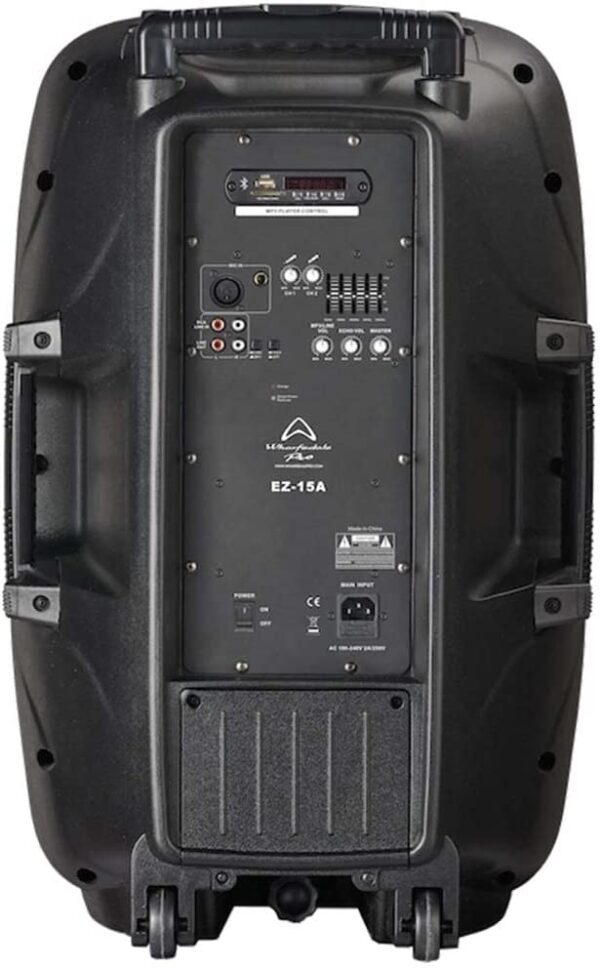 The Wharfedale Pro EZ-15A 863-865MHz active portable sound speakers deliver high-quality performance in a portable system. Powered by an AC output or an internal battery, this device is essential for mobile street artists. Comes with 2 wireless microphones and wired mic inputs, ideal for a variety of voice applications, such as weddings, speeches, conferences, etc. With internal MP3 player, Bluetooth connectivity and standard analog connectors, any input can be used for support tracks. System type: Active portable PA, Frequency range: 55 Hz – 18 KHz, Frequency range: 4 Ω, LF transducer size: 15″, LF transducer voice coil: 38 mm/1.5-inch, HF transducer: 2.5 cm, Disperator sion (H x V ): 90° x 50°, SPL max: 118 dB, Mic input: XLR and 1/10.1/12 cm jack, Line input: L/R RCA connector, Line output: L/R RCA connector, 5-band graphic EQ: 63 Hz/80 Hz/480 Hz/3 KHz z/10 KH. z +/-12 dB, Wireless microphone range: 40 m (theoretical value), Echo: Yes, MP3 player type: Yes (USB/TF), Bluetooth range: 10 m, Power (Peak): 140 W, Battery power: 12 V, 7.0 5 Ah battery lead, THD Amp: 0.1% 20 Hz to 20 kHz, Amp frequency response: 20 Hz – 20 KHz +/-1 dB, Input voltage: 100 v-240 v 50 Hz/60 Hz.
